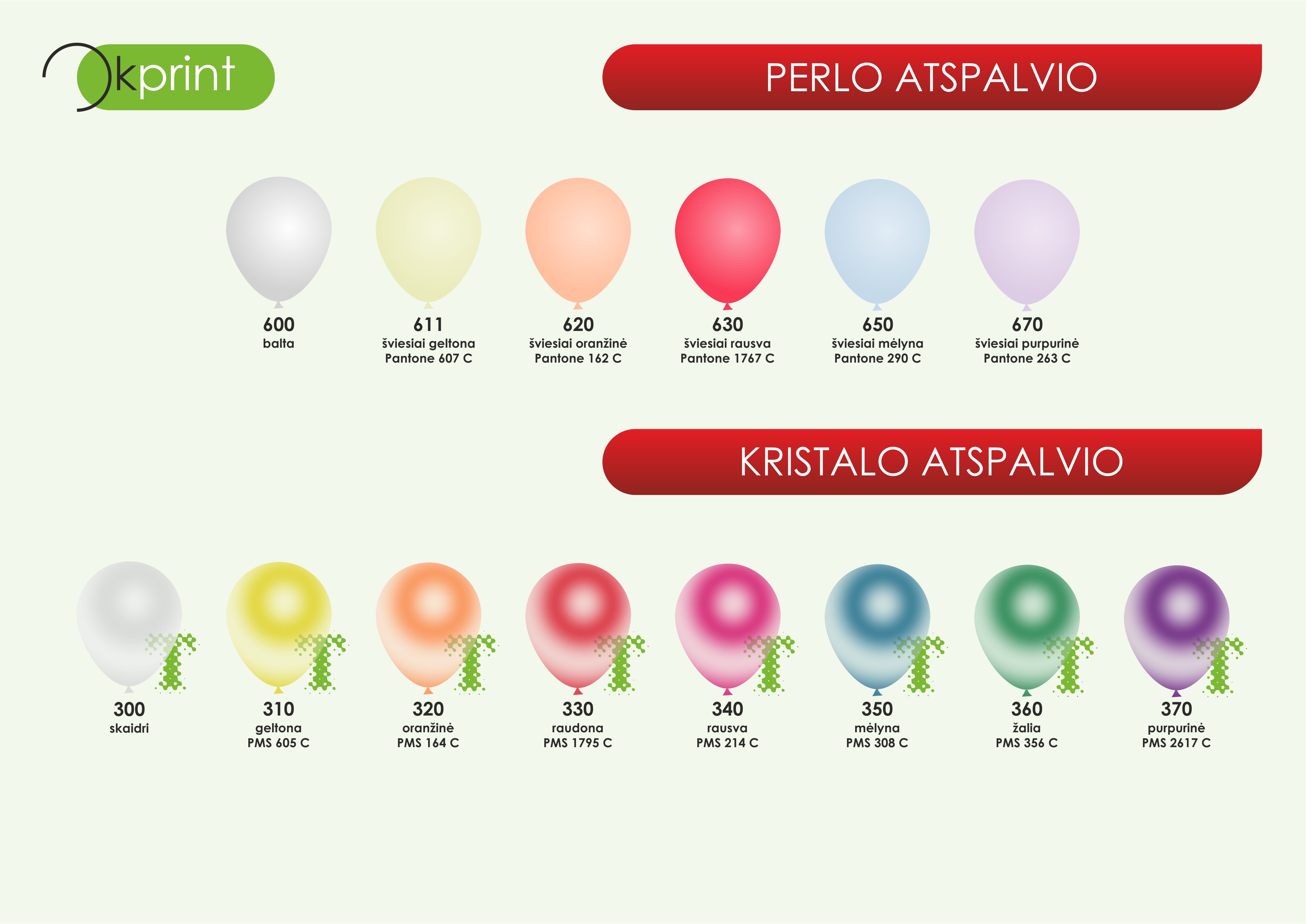 Balionų dydžiai ir spalvos: